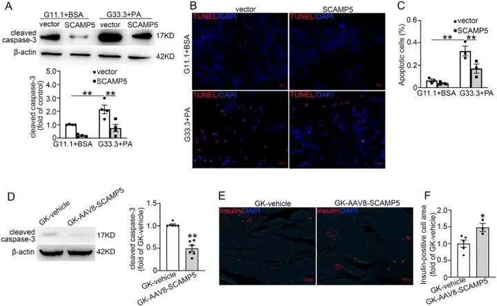 为探究SCAMP5影响胰岛素分泌的机制,研究团队检测了其对Caᵥ1.2表达的作用,Caᵥ1.2是L型电压依赖性钙通道的孔道形成亚基,而该通道在胰岛素分泌中发挥关键作用。结果显示SCAMP5缺失下调Caᵥ1.2表达,而SCAMP5过表达则上调Caᵥ1.2表达。此外,Scamp5 cKO小鼠胰岛中,钙通道激动剂Bay K8644增强GSIS的效应显著减弱;AAV8-SCAMP5处理的GK大鼠胰岛中,Bay K8644对GSIS的增强作用明显增强。这些发现突出了CaV1.2在SCAMP5介导的胰岛素分泌调节中的重要作用。接着,研究团队探索了SCAMP5表达水平的改变对β细胞凋亡的影响,体内外数据均表明SCAMP5缺失促进β细胞凋亡,SCAMP5过表达抑制β细胞凋亡。