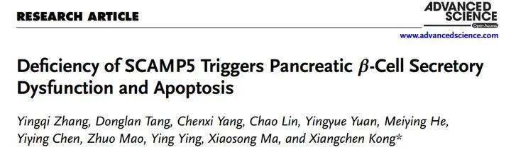 2型糖尿病(T2D)晚期的核心病理特征是胰腺β细胞分泌功能障碍和凋亡增加,导致胰岛素分泌不足、血糖升高,但这一过程的潜在机制尚未完全阐明。分泌载体膜蛋白5(SCAMP5)在β细胞中的表达及功能未知,需明确其是否参与糖尿病β细胞功能衰竭。近期,深圳大学医学部孔祥臣研究团队在Advanced Science (IF 14.1) 在线发表题为“Deficiency of SCAMP5 Triggers Pancreatic β-Cell Secretory Dysfunction and Apoptosis”的研究论文,强调了ChREBP调控的SCAMP5在β细胞胰岛素分泌和凋亡中的关键作用,揭示了糖尿病状态下β细胞功能衰竭的一个此前未被发现的机制。