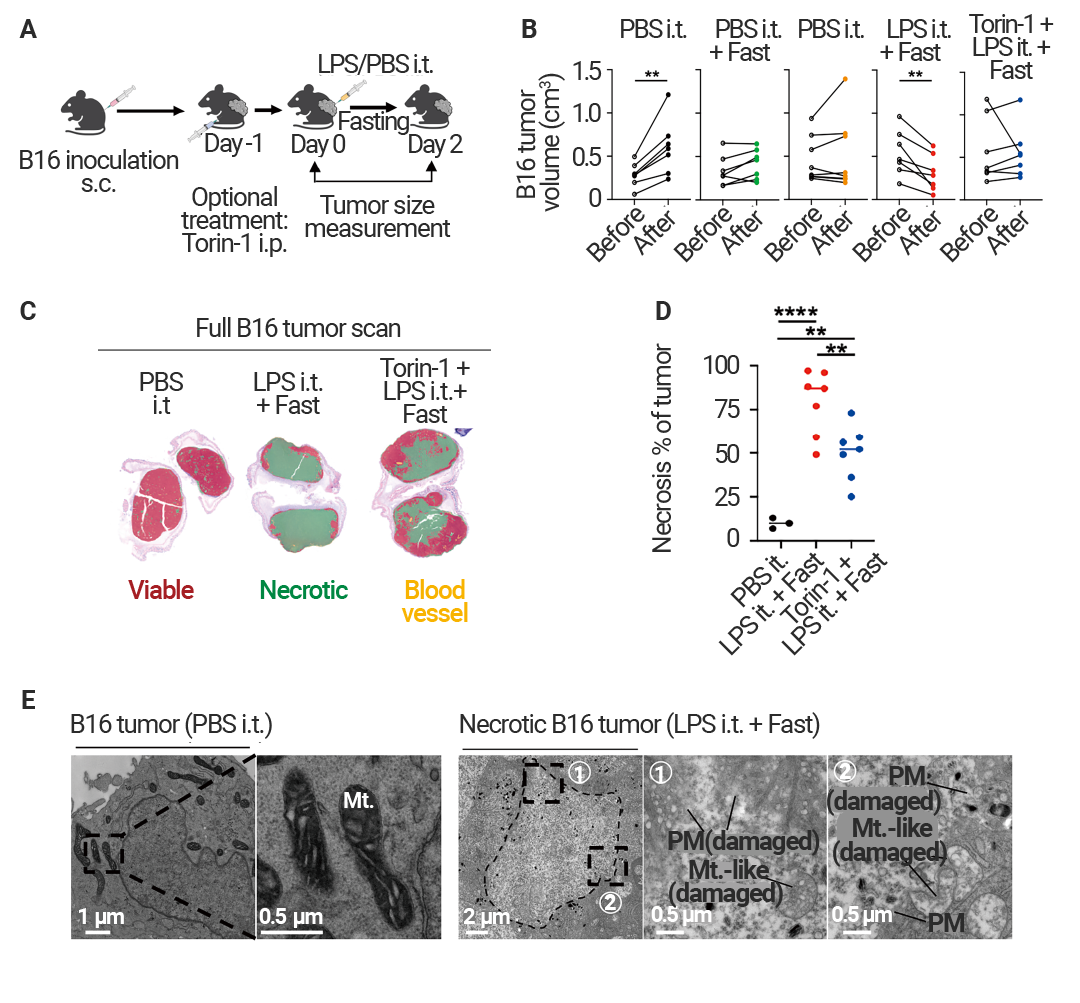 (A) 治疗策略示意图。s.c. 表示皮下给药;i.p. 表示腹腔注射;i.t. 表示肿瘤内注射。(B) 在 PBS 或 LPS 进行肿瘤内注射 (i.t.),并结合或不结合禁食与 Torin-1 预处理条件下,小鼠 B16 肿瘤大小的变化。(C-D) 指定实验组的肿瘤组织苏木精-伊红 (H&E) 染色图像,其中 (C) 标注了可存活区域与坏死区域,(D) 为其量化结果。(E) 对照组与处理组 (坏死区域) B16 肿瘤组织的代表性透射电镜 (TEM) 图像。Mt. 表示线粒体;Mt.-like 表示线粒体样结构;PM 表示细胞膜。