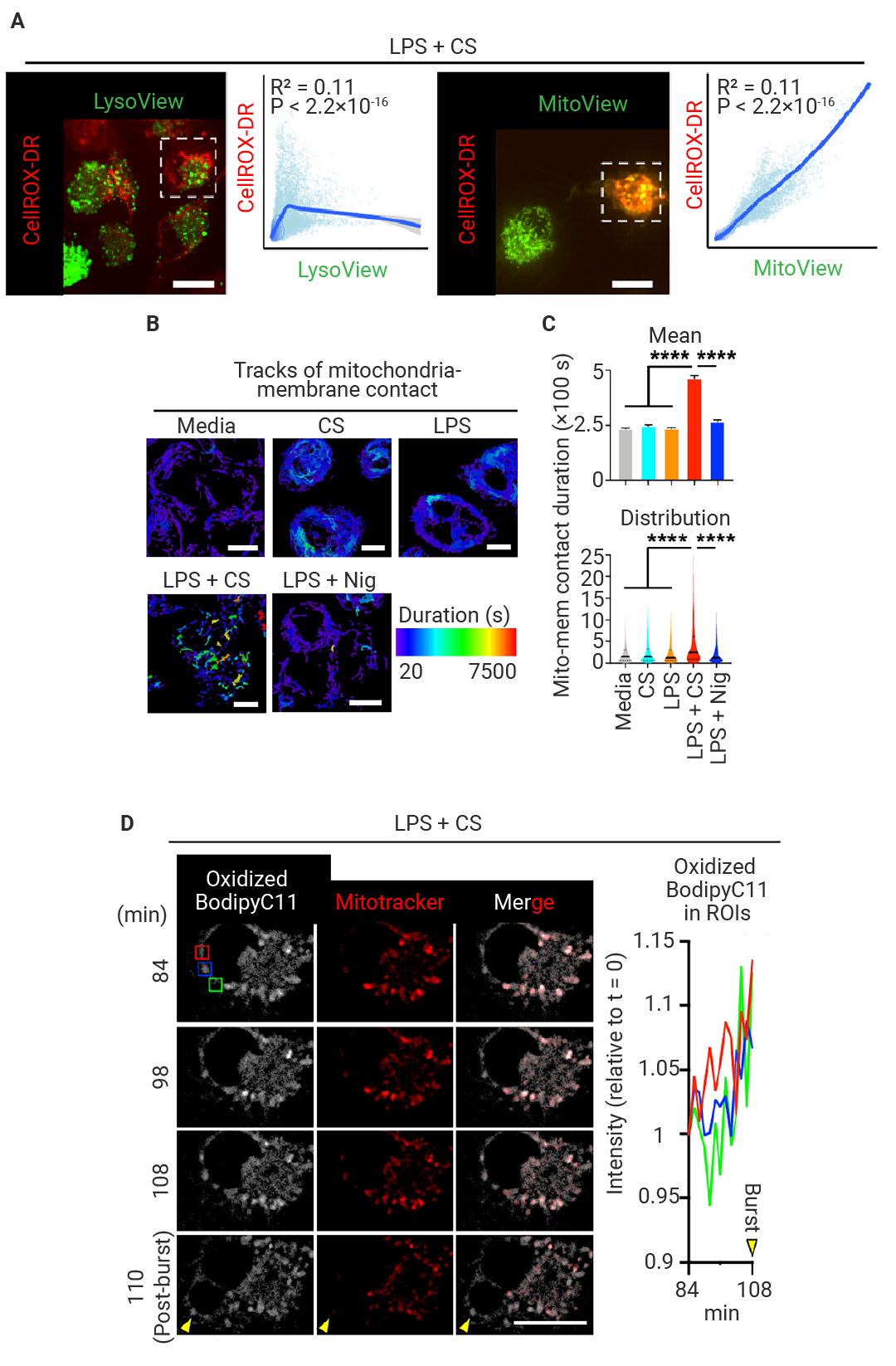 (A) 处于 CS 培养基并加入 LPS 的 BMDMs,在 14 小时使用所示探针进行染色的活细胞成像。图中同时展示了选框细胞的像素强度曲线,以及对应荧光信号之间的皮尔森相关性分析与 Loess 回归曲线。(B-C) 在所有测试条件下,线粒体均积极与膜结合,但当细胞仅用培养基、CS 或 LPS处理时,大多数结合是短暂的 (<4 min) (B 和 C)。相比之下,LPS 加 CS 诱导的结合时间显著延长,一些线粒体与膜的结合时间延长 (>20 min) (B 和 C)。(D) 在细胞膜变形发生之前,线粒体持续定位于细胞周边靠近膜破裂的部位 (Mitotracker 通道)。周边脂质过氧化灶也与线粒体共定位 (Oxidized BodipyC11 和 Merge 通道)。