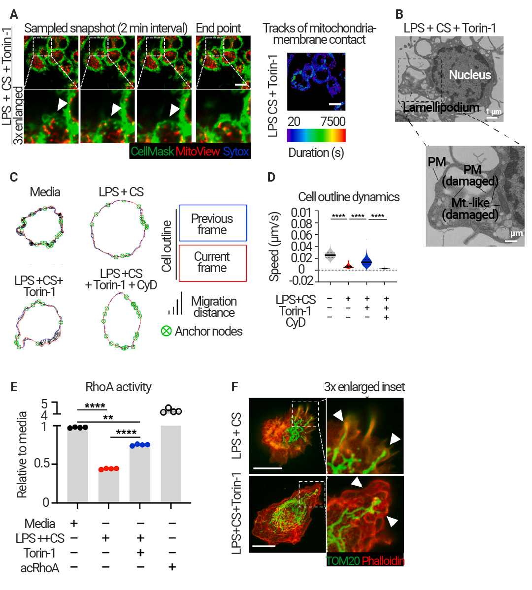 (A) 处于 CS 培养基并加入 LPS 及 Torin-1 刺激的 BMDMs 的活细胞成像。CellMask (绿色,标记细胞膜);MitoView (红色,标记线粒体);Sytox DR (蓝色,用于标记细胞膜受损后进入细胞的 DNA) (另见视频 S9)。成像开始于刺激后 14 小时,所示图像之间间隔 2 分钟。用于绘制细胞膜相关线粒体定位的轨迹,并根据线粒体与细胞膜接触的持续时间以颜色区分。白色箭头标示周边区域的线粒体共定位与伪足 (lamellipodium) 回缩现象。(B) 来自经 LPS + CS + Torin-1 处理 16 小时的 BMDMs 的代表性透射电镜(TEM)图像。Mt.-like 表示线粒体样结构;PM 表示细胞膜。(C-D) 采用 QuimP 分析细胞轮廓动态。(C) 显示连续两个时间点的代表性细胞轮廓叠加图;(D) 显示在所有时间点中细胞轮廓运动的速度分布 (另见视频 S10)。(E) 在所示条件下刺激 BMDMs 12 小时后检测 RhoA 活性 (RhoA-GTP)。Active RhoA (acRhoA) 作为阳性对照。(F) BMDMs 在 LPS + CS 条件下 ± Torin-1 处理 16 小时后的代表性 tauSTED 成像,显示线粒体 (TOM20;绿色) 和膜褶伪足 (lamellipodium) 中的肌动蛋白 (鬼笔环肽;phalloidin;红色) 。白色箭头标示细胞膜突起结构。
