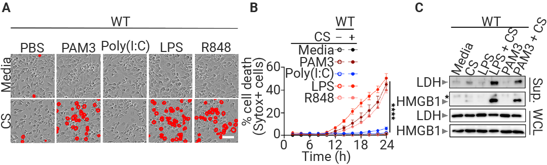 但将碳饥饿与 PAM3、LPS 或 R848 联合使用 (不包括 poly[I:C]),则会诱导强烈的细胞溶解性死亡 (图 1A 和 1B)。同时,发现细胞膜破裂的标志物——乳酸脱氢酶 (LDH) 和高迁移率族蛋白 B1 (HMGB1) 的释放 (图 1C)。