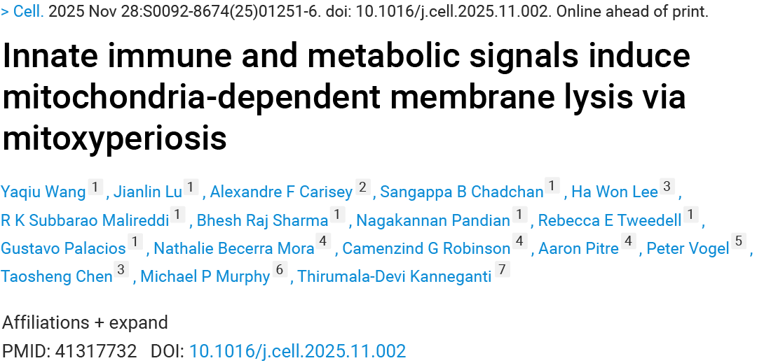 [1] Wang Y, Lu J, Carisey AF, et al. Innate immune and metabolic signals induce mitochondria-dependent membrane lysis via mitoxyperiosis. Cell. Published online November 28, 2025.