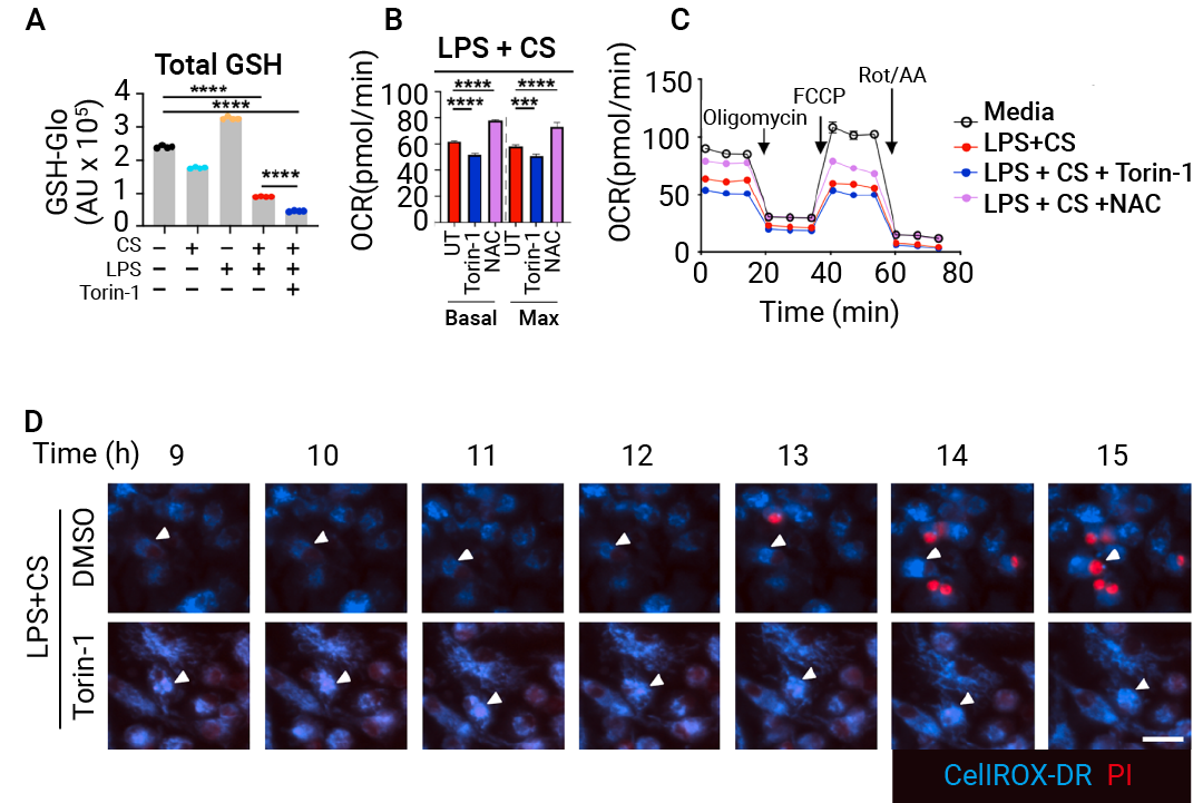 (A) 在所示条件下刺激 BMDMs 12 小时后,从全细胞裂解液 (WCL)中检测氧化应激水平 (以全谷胱甘肽 GSH 含量衡量)。(B-C) 在所示条件下刺激 BMDMs 12 小时后,利用 Seahorse 测得的氧耗率 (OCR)。其中,(B) 显示基础及最大 OCR,(C) 显示 OCR 动态变化。(D) BMDMs 在 LPS + CS 条件下 ± Torin-1 的活细胞成像 (拍摄于所示时间点)。CellROX-DR (蓝色) 指示细胞氧化应激,PI (红色) 指示细胞死亡。白色箭头标示氧化应激增强的代表性细胞。时间轴相对于刺激开始时间。