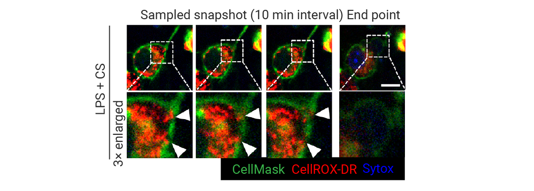 作者进一步进行了共聚焦活细胞成像 (图 5)。在 LPS + CS 的作用下,细胞内代表氧化应激的 CellROX-DR 阳性斑点长时间稳定地定位于靠近质膜的位置 (>20 min) 。在斑点与质膜接触的部位,质膜最初发生退化,最终破裂,使不透膜的 Sytox 染料得以进入并染色细胞核。