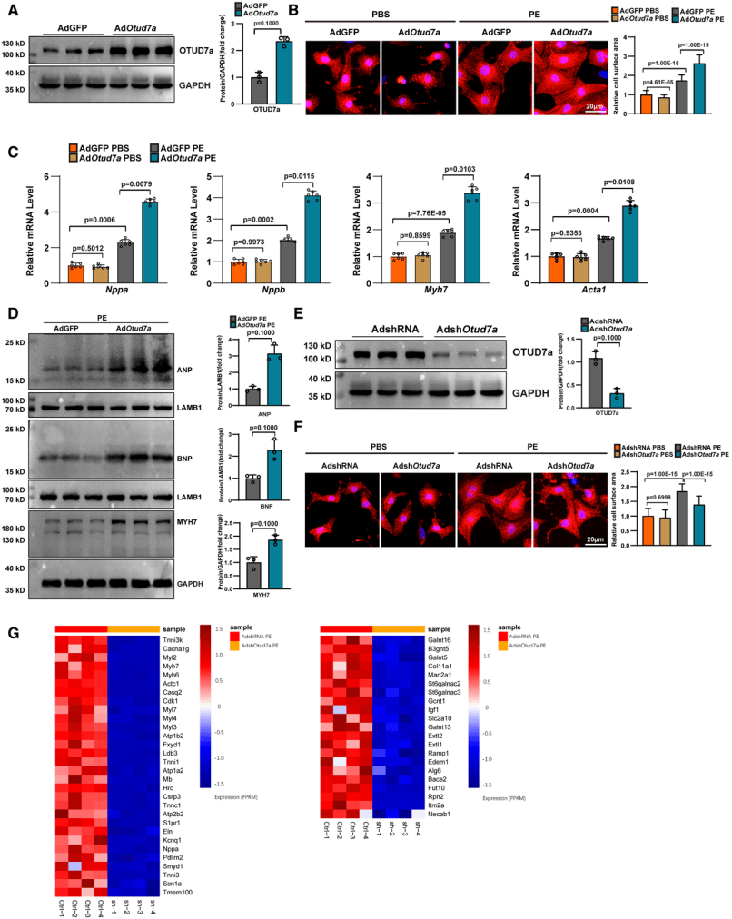 研究结果证实OTUD7a在体内TAC手术和体外苯肾上腺素诱导的心肌肥厚模型中表达上调,全身性敲除OTUD7a可减轻小鼠压力超负荷诱导的心脏功能障碍与结构重塑,RNA测序及基因集富集分析显示OTUD7a调控的基因在纤维化、心脏功能和蛋白质加工通路中富集,提示OTUD7a可能参与这些生物学过程来影响心脏重塑。随后构建OTUD7a杂合敲除小鼠模型,证实杂合敲除OTUD7a减轻了TAC诱导的小鼠心肌重构与心功能障碍。进一步在心肌组织特异性敲除及过表达OTUD7a以确定其在体内心脏重塑和功能障碍中的功能作用,结果显示心肌特异性缺失OTUD7a可减轻小鼠病理性心肌肥厚并改善心功能障碍,过表达OTUD7a则产生相反的结果。体外验证实验中以新生大鼠心肌细胞为研究对象,PE刺激成功构建体外心肌肥厚模型,通过腺病毒实现OTUD7a过表达或沉默,结果表明OTUD7a在体外可调控去氧肾上腺素(PE)诱导的心肌细胞肥厚,过表达OTUD7a促进该病理过程,沉默则抑制。