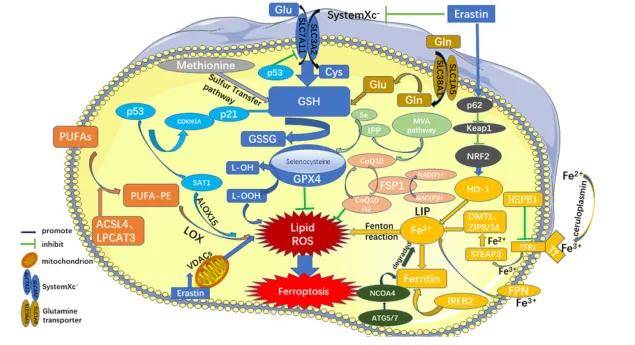 铁死亡主要是细胞内脂质活性氧生成与降解的平衡失调所致。当细胞抗氧化能力降低,脂质活性氧堆积,就能引起细胞氧化性死亡,即铁死亡。铁死亡可以被多种化合物所诱导,虽然其发生的信号通路不同,但是上游通路最终都是通过直接或间接影响谷胱甘肽过氧化物酶 (glutathione peroxidase,GPXs)的活性,降低细胞抗氧化能力,致使脂质过氧化反应增加,脂质活性氧增多,引起铁死亡的发生。