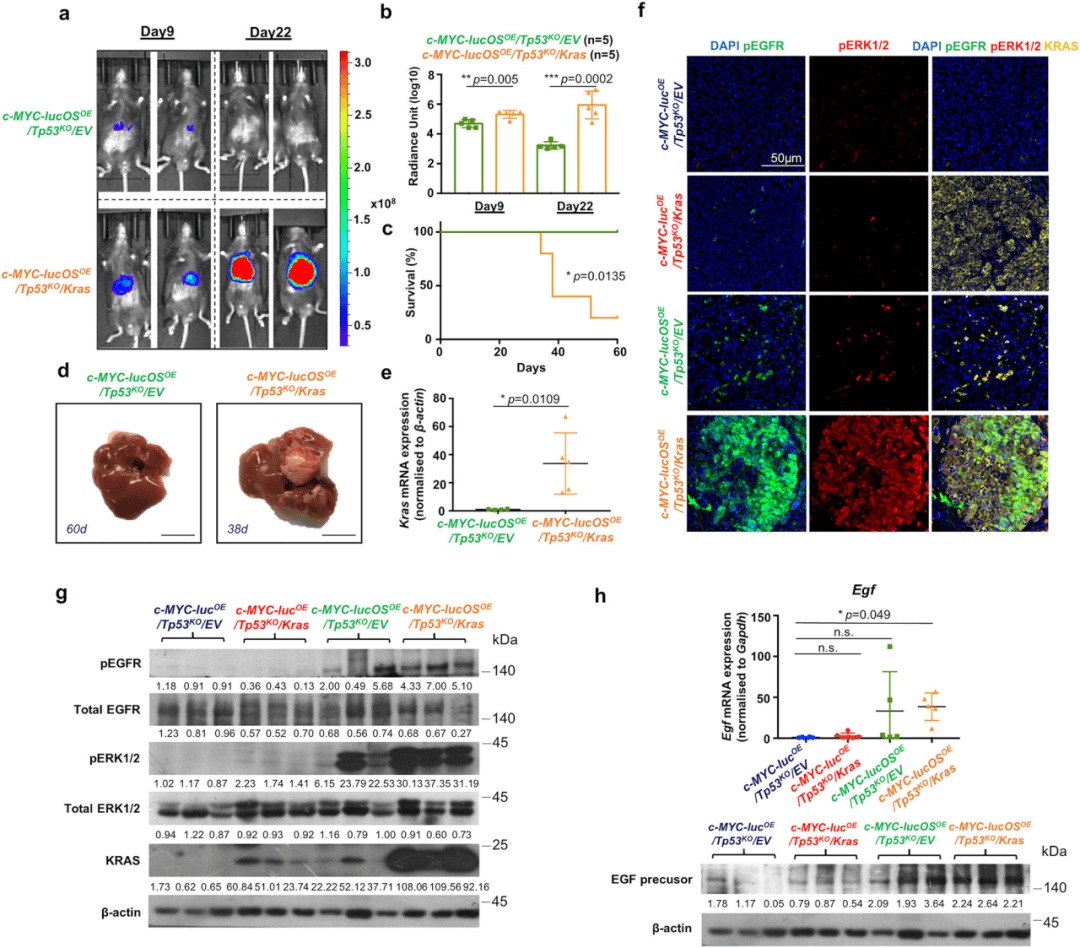 研究人员构建了一个具有免疫活性的c-MYC-LucOE/Tp53KO 小鼠肝癌模型,模拟T细胞对肿瘤的识别与攻击,结果发现抗肿瘤T细胞反应未能清除所有小鼠的肿瘤细胞,20%的小鼠出现肿瘤,这表明部分逃避了T细胞的监视。DIA蛋白质组学分析显示c-MYC-LucOE/Tp53KO 肝癌免疫逃避小鼠模型中致癌KRAS信号丰富,并且野生型KRAS在肝癌组织中表达上调,与不良预后有关。为了验证KRAS信号促进免疫逃避的假设,研究人员在c-MYC-LucOE/Tp53KO 肝癌中过表达了野生型Kras。值得注意的是,所有c-MYC-lucOSOE/Tp53KO/Kras 小鼠发生的肿瘤在形态和分子特征上都显示出肝癌的表型,表明完全逃脱了免疫监视。进一步实验表明,在EGF刺激下,野生型KRAS过表达通过激活EGFR/KRAS/ERK轴促进免疫逃避。