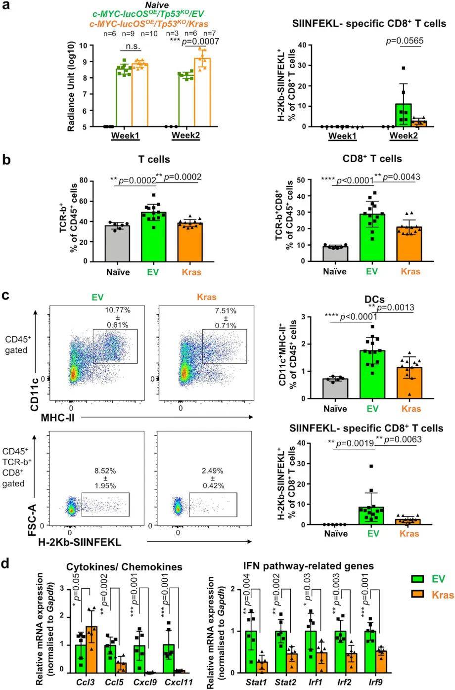 1、野生型KRAS过表达消除c-MYC-LucOE/Tp53KO模型中的抗肿瘤T细胞反应并促进免疫逃避
