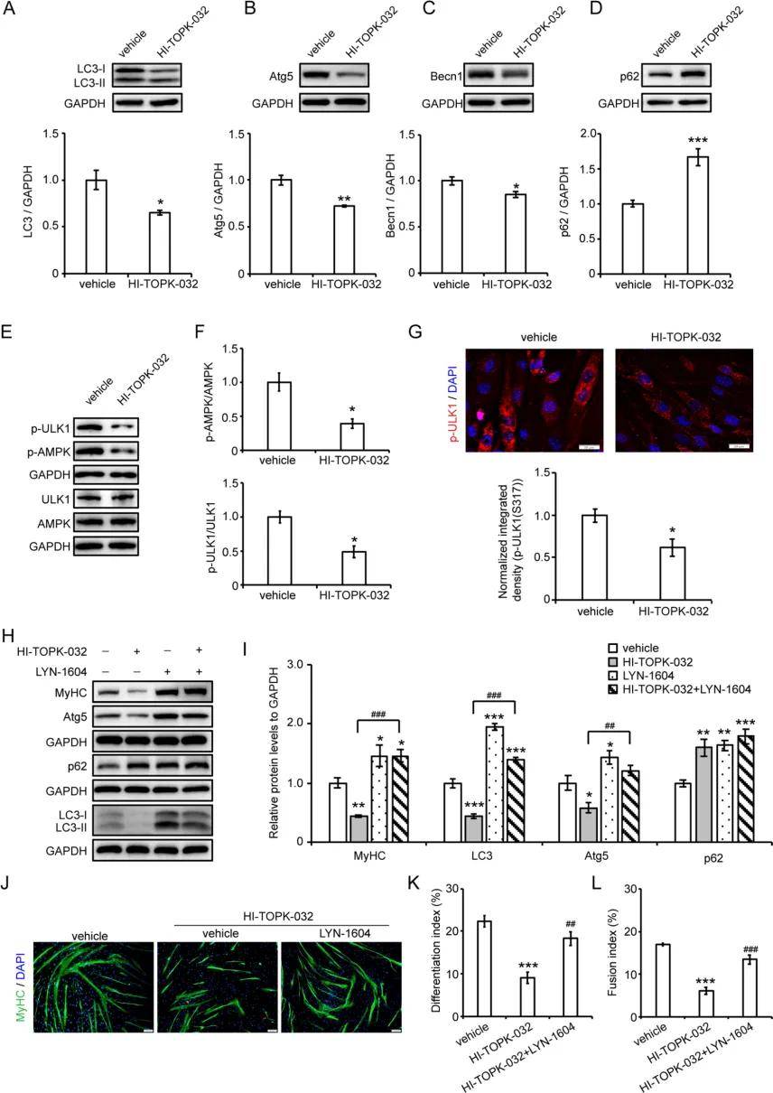 作者通过将敲低Pbk或过表达Pbk-Flag的慢病毒分别导入C2C12细胞,证实了Pbk对于C2C12的增殖和存活必不可少,并发现Pbk在成肌细胞分化过程中被上调并被限制从细胞质向细胞核移位,Pbk依赖其激酶活性正向调控成肌细胞分化。作者进一步探索了Pbk如何促进成肌细胞分化,发现在成肌分化过程中自噬上调,Pbk依赖其激酶活性调控分化C2C12细胞中的肌源性自噬。然后作者探究了Pbk调控自噬的分子机制,结果发现Pbk以其激酶活性依赖的方式调控AMPK激活和随后的ULK1磷酸化。此外ULK1激活剂LYN-1604能够抵消HI-TOPK-032对C2C12 细胞自噬激活和成肌细胞分化的抑制作用。免疫荧光测定进一步证实,由HI-TOPK-032或Pbk敲低诱导的C2C12细胞的分化和融合受损,在用LYN-1604处理后是可逆的。以上发现表明,在成肌细胞分化过程中,Pbk通过促进AMPK激活诱导的ULK1磷酸化来促进肌源性自噬。