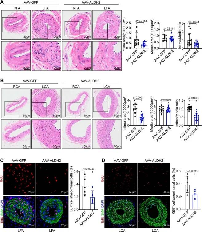 使用AAV2-SM22α-shSLC38A2注射VSMC特异性ALDH2敲除小鼠及其对照小鼠中,实现VSMC特异性SLC38A2敲低,四周后对小鼠进行股动脉导丝损伤和颈动脉结扎手术,以诱导血管新生内膜形成。研究数据显示,ALDH2敲除小鼠新生内膜面积和内膜/中膜面积比显著增加,敲低SLC38A2明显减轻上述新生内膜形成。Ki67免疫荧光染色显示,在VSMC特异性ALDH2缺失组中,损伤动脉内增殖的Ki67阳性细胞数量的增加,可被SLC38A2缺失所消除。这些结果证明,ALDH2缺陷通过SLC38A2促进血管平滑肌细胞增殖及损伤诱导的新生内膜形成。进一步探究发现ALDH2的酶活性是其发挥保护作用的核心,其功能丧失会直接加剧疾病。