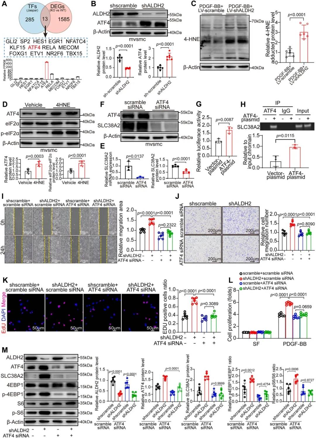 mRNA测序和代谢组学分析显示,在ALDH2敲除的VSMCs中,谷氨酰胺和谷胱甘肽的水平显著升高,并且谷胱甘肽代谢通路被富集。对谷氨酰胺转运蛋白进行筛选后发现,SLC38A2在mRNA和蛋白水平上均被ALDH2缺陷特异性上调,而其他转运蛋白未受影响。在VSMCs中过表达SLC38A2,能够模拟ALDH2敲除的表型,即促进PDGF-BB诱导的细胞增殖、迁移并激活mTORC1信号通路。在ALDH2敲低的VSMCs中,使用siRNA敲低SLC38A2,可以有效逆转由ALDH2缺陷引起的mTORC1信号激活、细胞增殖和迁移增强。研究团队探索了ALDH2上调SLC38A2表达的分子机制,通过mRNA-seq数据与Jaspar数据库预测的转录因子进行交叉比对,筛选出13个潜在调控SLC38A2的转录因子。其中,激活转录因子4(ATF4)表达量最高,且实验证实ALDH2敲低会显著上调ATF4的表达水平。进一步的研究发现ALDH2缺陷激活转录因子ATF4,使其与SLC38A2基因启动子的结合增加,从而驱动SLC38A2的转录,体外数据表明ATF4是ALDH2-SLC38A2介导的谷氨酰胺摄取和VSMC增殖所必需的。