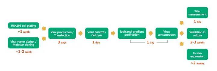 首先,将外源基因克隆进入腺相关病毒载体,将携带外源基因的重组质粒与辅助质粒Ad Helper Vector和pAAV-rep/capVector共转染包装细胞HEK293T,转染72h后细胞内会产生大量的重组病毒。分别收获培养基上清与细胞沉淀,用PEG8000沉淀培养基上清中的病毒,裂解细胞沉淀收毒,合并从细胞沉淀和上清中得到的病毒。接下来,对收集的病毒进行纯化浓缩,滴度、纯度检测。