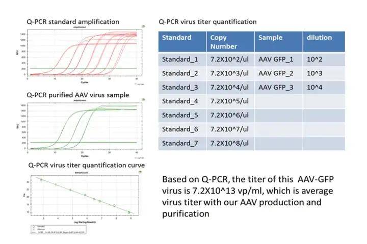 通过QPCR的方法来检测AAV病毒滴度,得到的结果为包装得到的病毒颗粒数。其原理是用腺相关病毒基因组特异性引物进行实时定量PCR。在定量曲线的线性范围内,Ct值与已知拷贝数质粒的Ct值的比值即为病毒基因组的初始拷贝数。