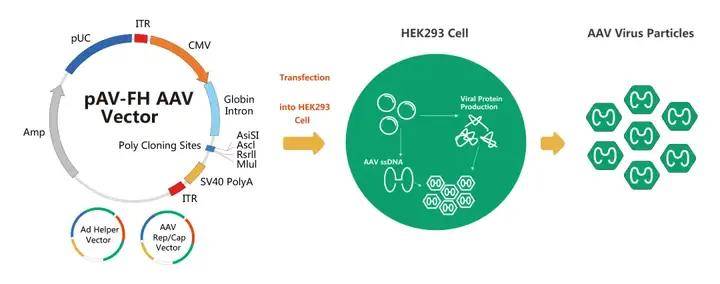 AAV无辅助病毒系统(AAV Helper-Free System)可以在无辅助病毒的条件下生产出重组腺相关病毒。这种系统利用已经明确与调节AAV复制和表达的腺病毒基因产物,并且将这些基因产物通过转染引进宿主细胞。重组腺相关病毒(rAAV)由多个质粒(Cis质粒、辅助质粒、Rep/Cap质粒)组成,利用三质粒共转染方法进行rAAV的生产。包装细胞反式提供AAV的结构蛋白Cap及功能蛋白Rep,在包装辅助质粒Adv-Helper的帮助下,高效地将带有ITR的目的DNA片段包装到rAAV病毒颗粒中。