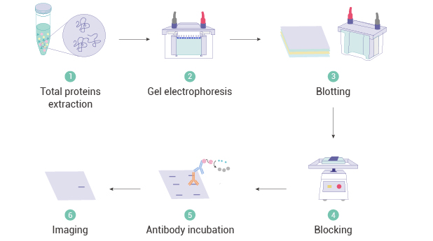 蛋白样本制备 → 电泳 → 转膜 → 封闭 → 孵育抗体→ 显影