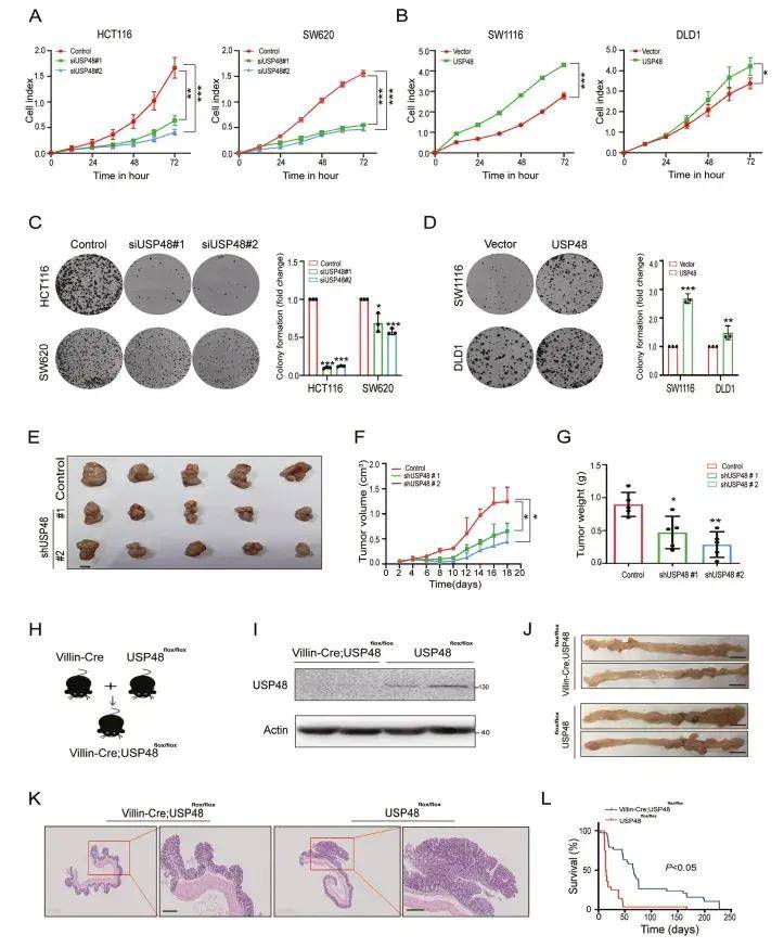 作者研究发现USP48表达的增加与自噬抑制和结直肠癌患者的不良预后有关。进一步探究了USP48在结直肠癌中的作用,发现USP48基因的敲低导致HCT116和SW620细胞生长曲线变慢,并形成更小和更少的细胞克隆;USP48的过表达在SW1116和DLD1细胞中起到相反的作用。此外,通过Transwell实验观察到USP48增强了CRC细胞的迁移和侵袭能力。这些结果共同证明了USP48在体外对结直肠癌细胞的恶性生物学特性有促进作用。使用稳定下调USP48的HCT116细胞诱导的异种移植瘤模型和相应的对照来检测USP48对体内结直肠癌的影响。结果表明,与对照组相比,USP48基因敲低抑制了肿瘤的生长,表现为肿瘤体积较小,肿瘤重量减轻。在肠上皮细胞USP48缺乏的小鼠模型中诱导结肠炎和结直肠癌,USP48的缺失减少了AOM/DSS诱导的肿瘤形成,并伴随着小鼠的存活时间延长。以上结果表明USP48作为癌基因发挥作用,在体外和体内都促进了结直肠癌的进展。