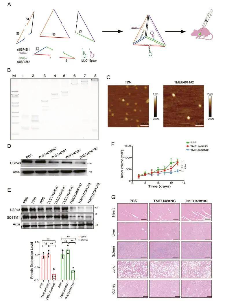 基于上述发现,作者设计并构建了一种在结直肠癌细胞中特异性抑制USP48的纳米材料TDN(TMEU48#1#2),用于治疗结直肠癌。实验证明了该纳米材料具有良好的细胞吸收效率,经MUC1和Epcam修饰后,其细胞吸收效率进一步提高,此外该纳米材料能有效抑制USP48的表达,两个siRNA的加入提高了USP48的基因抑制效果。利用荷瘤小鼠对纳米材料的体内抗肿瘤作用进行了评估,与PBS和TMEU48#NC组相比,TMEU48#1#2组的USP48显著下调,伴随着SQSTM1表达的减少;并且肿瘤生长受到明显抑制。这些发现强调了通过使用DNA纳米材料传递USP48 siRNA在体内有效地抑制结直肠癌的生长,表现出良好的生物安全性,并表明USP48可能是结直肠癌治疗的有希望的靶点。