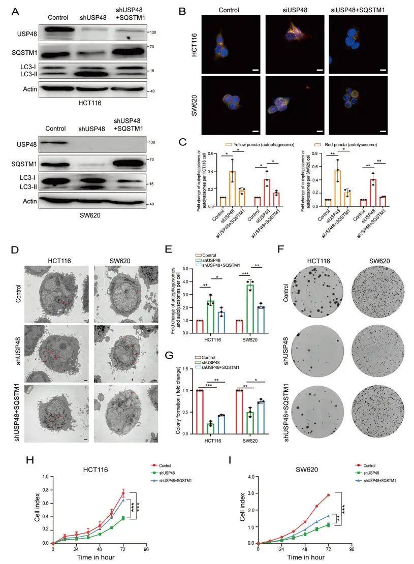 图2. USP48通过稳定SQSTM1抑制自噬并促进结直肠癌进展