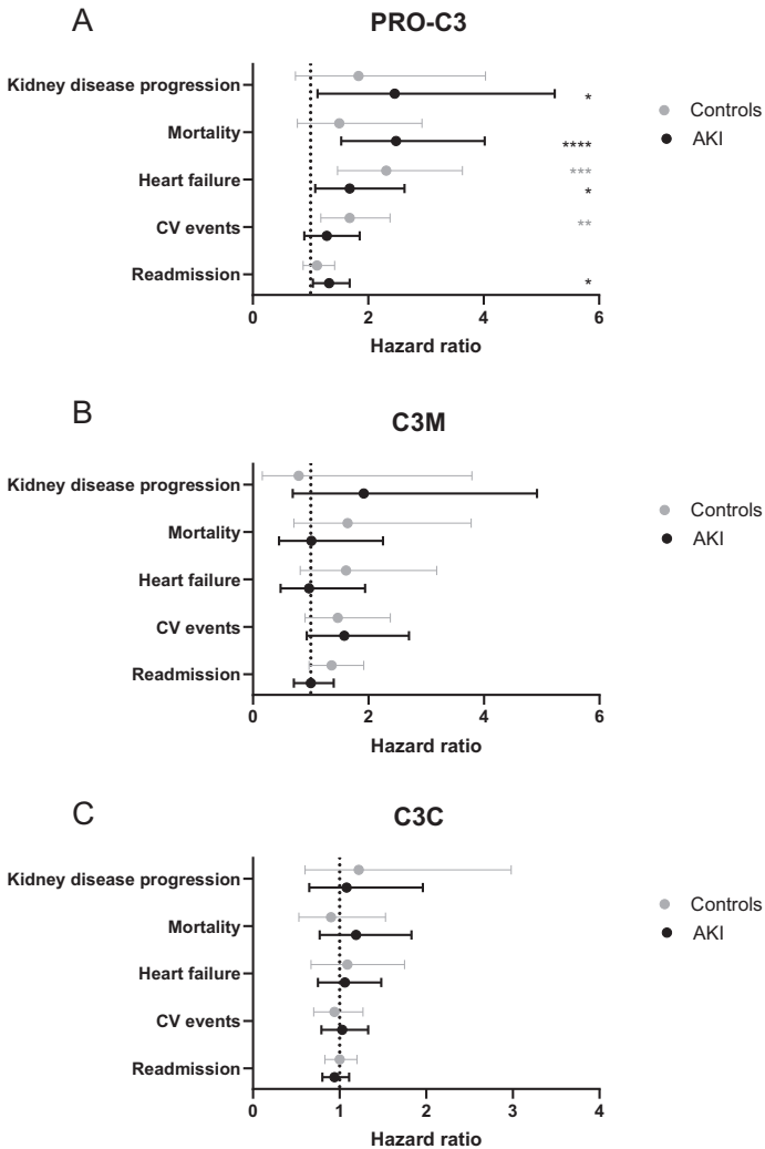 o 全因死亡:PRO-C3最高三分位组死亡风险显著升高(AKI组P<0.01,对照组P<0.05)。
