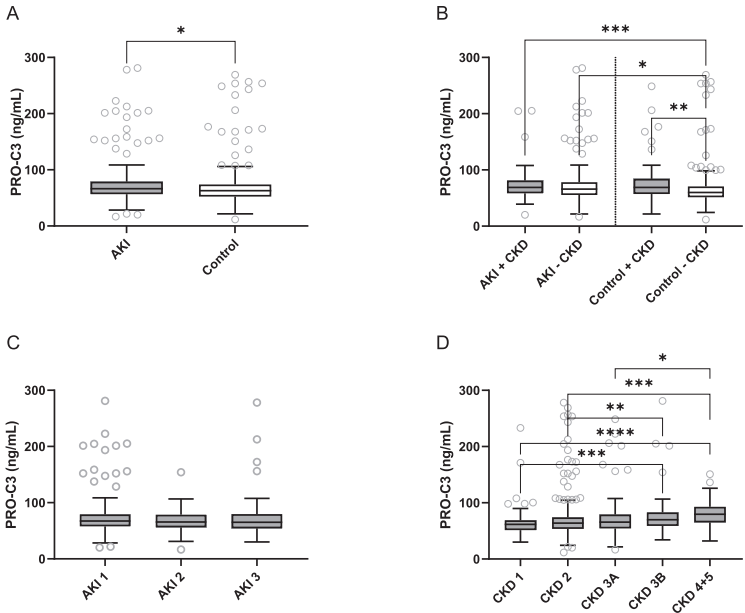 AKI组PRO-C3中位值为66.5 ng/mL,显著高于对照组的62.8 ng/mL(P<0.001),而C3M和C3C两组间无差异。