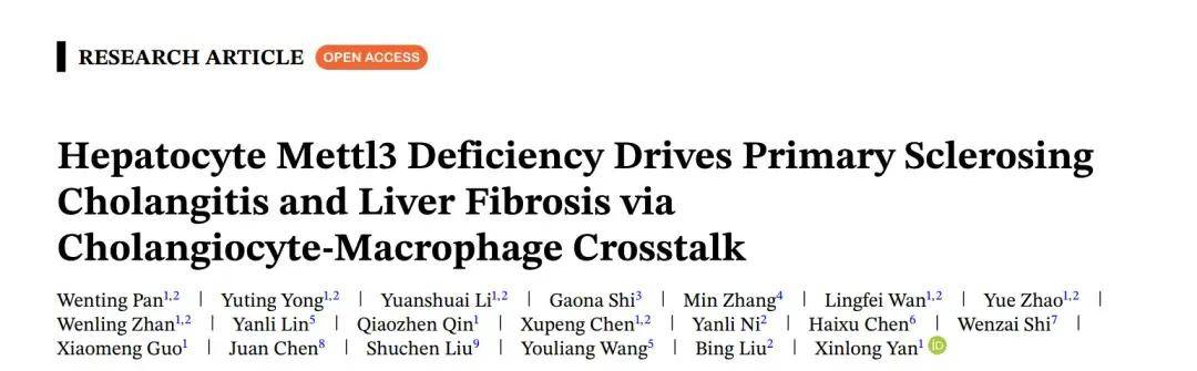 原发性硬化性胆管炎(PSC)是一种以胆道炎症和纤维化损伤为特征的进行性胆汁淤积性肝病,但由于其潜在分子机制尚未完全阐明,有效疗法仍然有限。2025年12月22日,北京工业大学阎新龙、解放军总医院第五医学中心刘兵、军事医学研究院生物工程研究所王友亮、军事医学研究院辐射医学研究所刘曙晨、中国农业大学陈娟团队联合在Advanced Science (IF 14.1)上发表文章“Hepatocyte Mettl3 Deficiency Drives Primary Sclerosing Cholangitis and Liver Fibrosis via Cholangiocyte-Macrophage Crosstalk”,发现Mettl3缺陷是PSC发病机制的关键驱动因素,表明靶向m6A转录组修饰是胆汁淤积性肝病一种有前景的治疗策略。