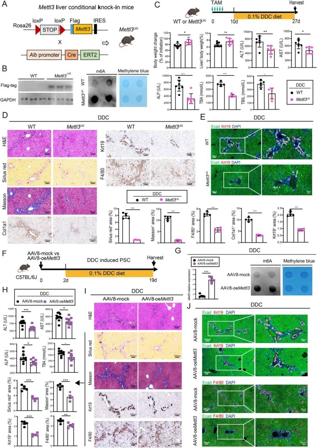 作者发现肝细胞特异性敲除Mettl3可诱导PSC,特征为进行性纤维化、胆管增生和免疫失调。之后作者通过肝细胞特异性Mettl3敲入和AAV8介导的肝脏Mettl3过表达两种方法研究了Mettl3在PSC中的作用。在肝细胞特异性Mettl3敲入小鼠(Mettl3LKI)中,发现Mettl3表达增加,RNA m6A水平升高,ALT、AST、ALP、TBA和TBIL血清水平降低,表明PSC损伤得到改善。组织学评估也表明Mettl3LKI小鼠对DDC诱导的PSC具有抵抗力。在AAV8介导的肝脏Mettl3过表达小鼠中,同样发现m6A水平和Mettl3表达增加,羟脯氨酸和血清ALT、AST、ALP和TBA水平降低;IHC分析显示AAV8-Mettl3治疗后DDC诱导的PSC小鼠中胶原蛋白沉积、胆管反应和巨噬细胞浸润减少;在CCl4诱导的肝纤维化模型中观察到类似的治疗效果,AAV8介导的Mettl3过表达抑制肝纤维化和炎症。这些发现表明肝细胞特异性Mettl3敲入和AAV8介导的Mettl3过表达均显著改善了DDC诱导的PSC的进展。