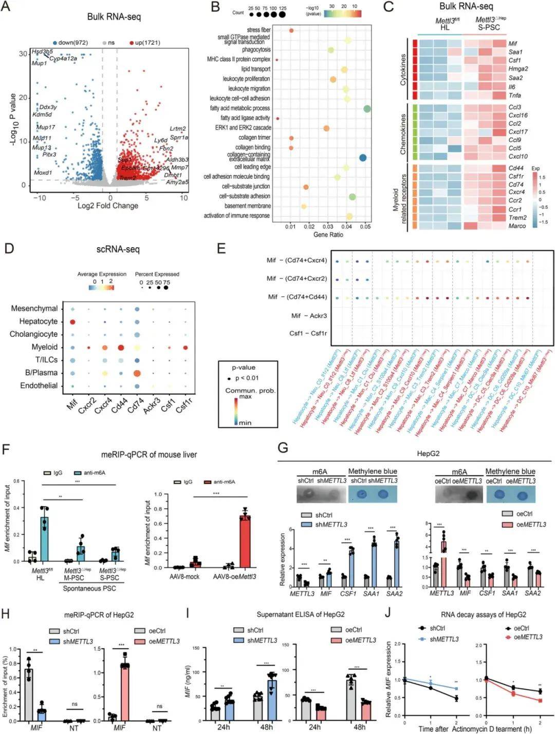 单细胞RNA测序表明Trem2+巨噬细胞是Mettl3△Hep(肝细胞Mettl3缺失)驱动的胆管病微环境重编程的关键介质。通路富集分析揭示了白细胞增殖和迁移、细胞-细胞粘附、细胞-基质连接和粘附过程、脂质转运和脂肪酸代谢激活,批量RNA-seq显示促炎因子显著上调,包括细胞因子(Mif、Csf1、Saa1和Saa2)和趋化因子(Ccl3和Cxcl16)及其相应的受体(Cd44、Cd74和Csf1r)对应物。体外细胞实验证实METTL3通过调节m6A水平来调节MIF、CSF1、SAA1和SAA2的表达,METTL3敲低减少了m6A并上调了这些细胞因子,而其过表达则产生相反的效果。ELISA分析发现HepG2细胞中METTL3敲低增加了MIF分泌,而METTL3过表达显著抑制其表达;放线菌素D测定进揭示了METTL3敲低后MIF和CSF1 mRNA衰期延长,但METTL3过表达后mRNA加速衰减,表明METTL3通过m6A介导的RNA衰减调节MIF和CSF1的稳定性。这些结果表明METTL3通过m6A甲基化调节肝细胞源性MIF和CSF1的表达,从而促进Trem2+巨噬细胞的募集并促进胆管细胞-巨噬细胞串扰,从而促进PSC进展。