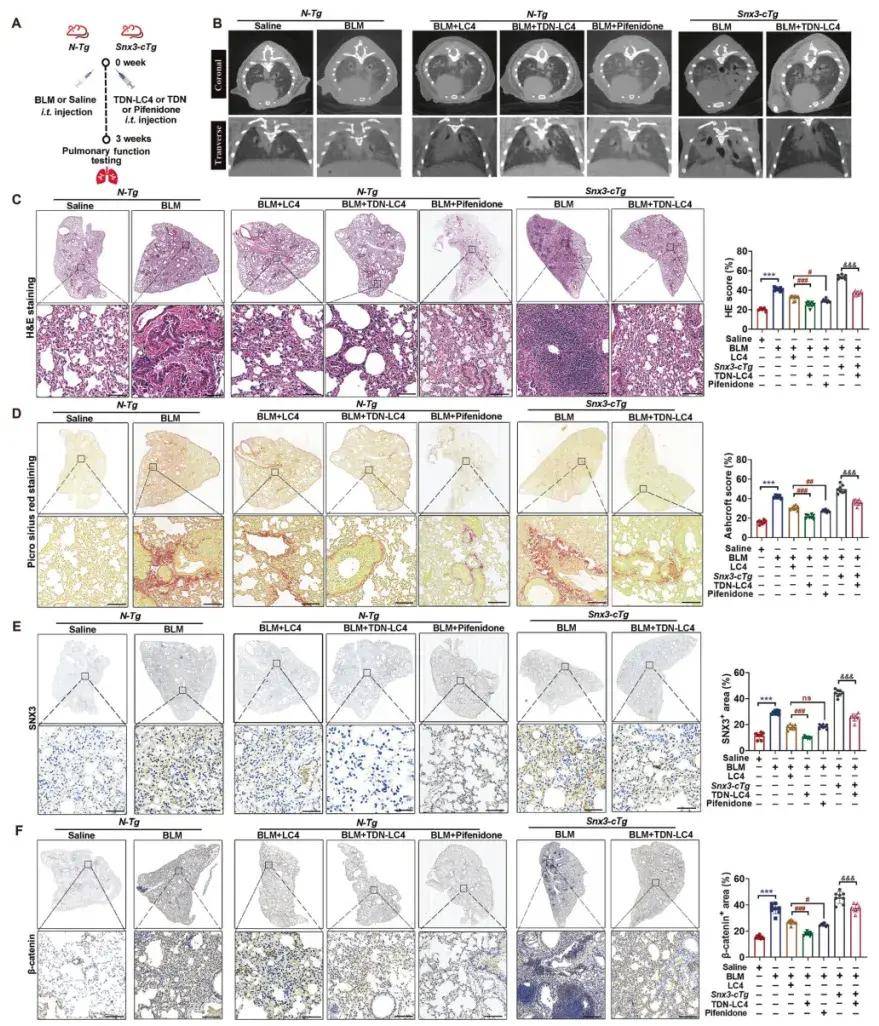 图3. 靶向SNX3的TDN-LC4改善肺功能障碍和纤维化