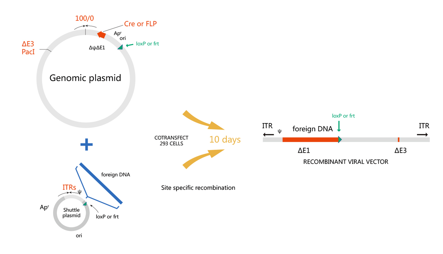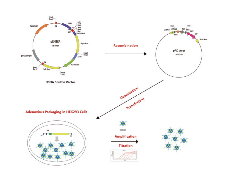 目前常用的腺病毒包装体系有 AdEasy 和 AdMAX 两种,其共同特点是目的基因首先克隆到穿梭载体,然后再重组至腺病毒骨架上。这两个系统均具有腺病毒早期转录复制基因 E1 和 E3 的缺陷 (ΔE1, ΔE3),其中E3 基因对病毒产生并非必需。因此,腺病毒包装必需依赖表达 E1 的细胞系,例如 HEK-293 等。 维真生物采用的腺病毒包装系统包括了 AdEasy 和 AdMax 系统,其中 AdMax 系统操作简便、重组效率高、获得的病毒产率也高,是当前腺病毒包装主要采用的系统。