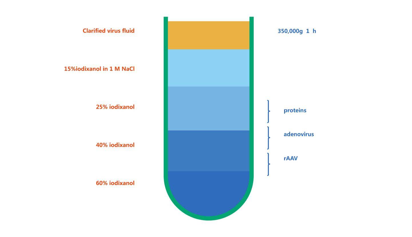 采用碘克沙醇密度梯度超速离心法对AdV病毒进行纯化。碘克沙醇是一种造影剂,已接受了临床检验。它具有非离子型、对细胞无毒和代谢惰性等优点。现在在病毒纯化方面应用广泛。它利用不同颗粒之间存在的沉降系数差,在一定离心力作用下,颗粒各自以一定速度沉降,在密度梯度不同区域上形成区带。