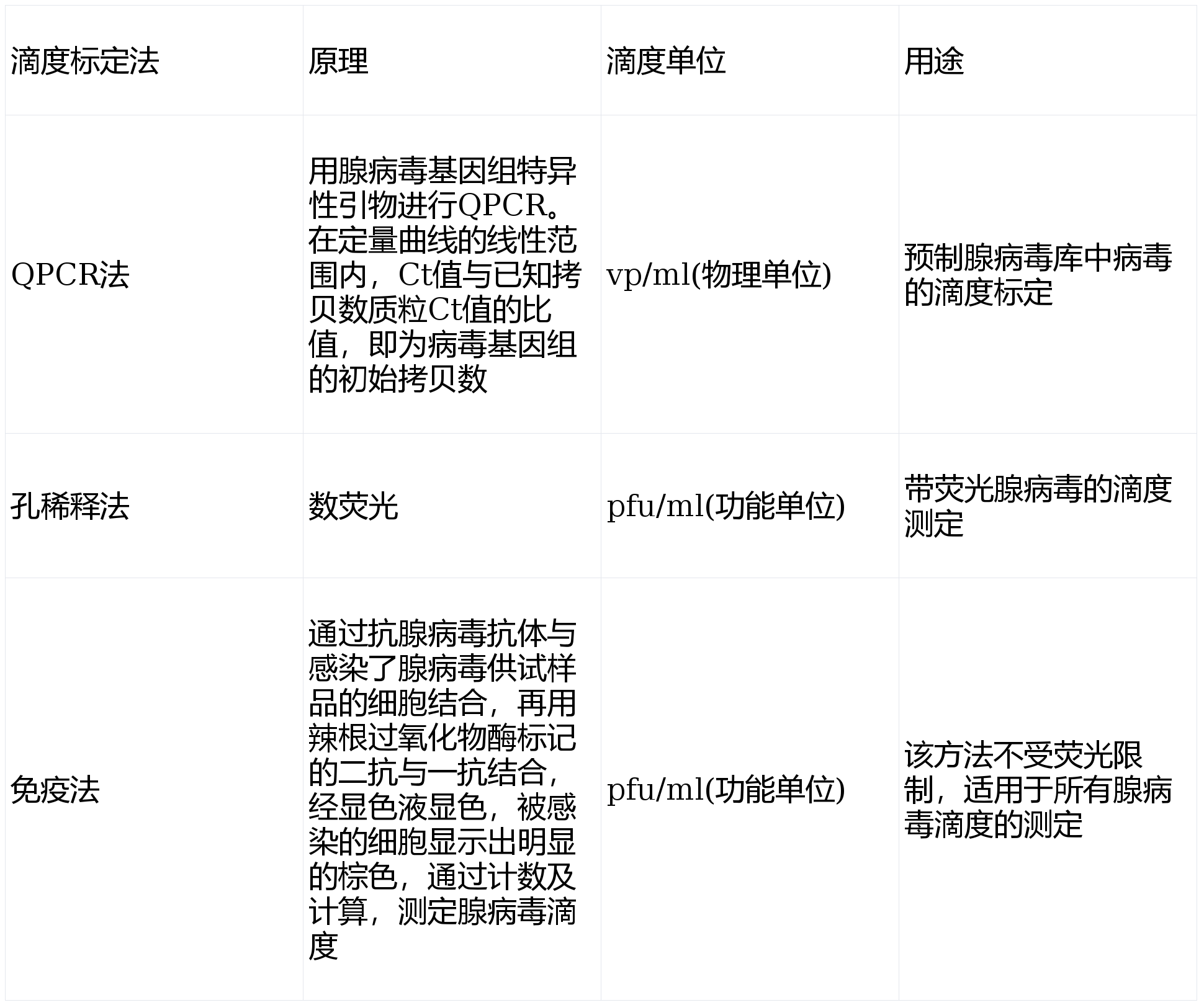 AdV病毒采用多种方法来定量,主要包括QPCR法、孔稀释法和快速腺病毒滴度免疫检测法。