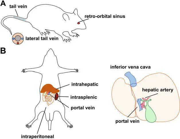 (A)小鼠侧视图,显示侧尾静脉或眶静脉窦注射路线;(B)小鼠仰卧位图,显示非手术腹膜内和手术肝内、脾内和门静脉输送路径。