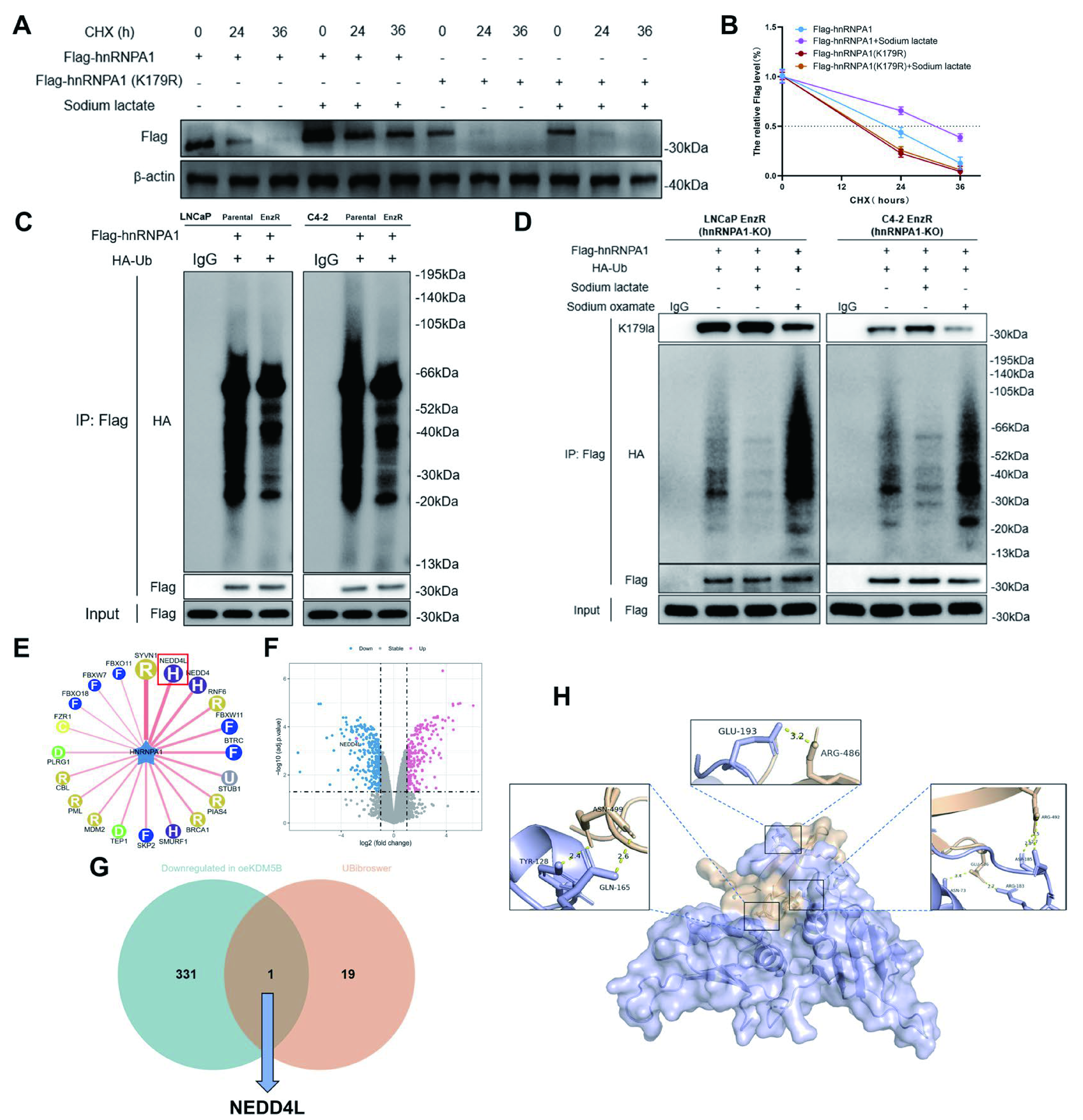 图5.K179的乳酸化通过抑制hnRNPA1的NEDD4L介导泛素化和蛋白酶体降解来稳定其蛋白酶体