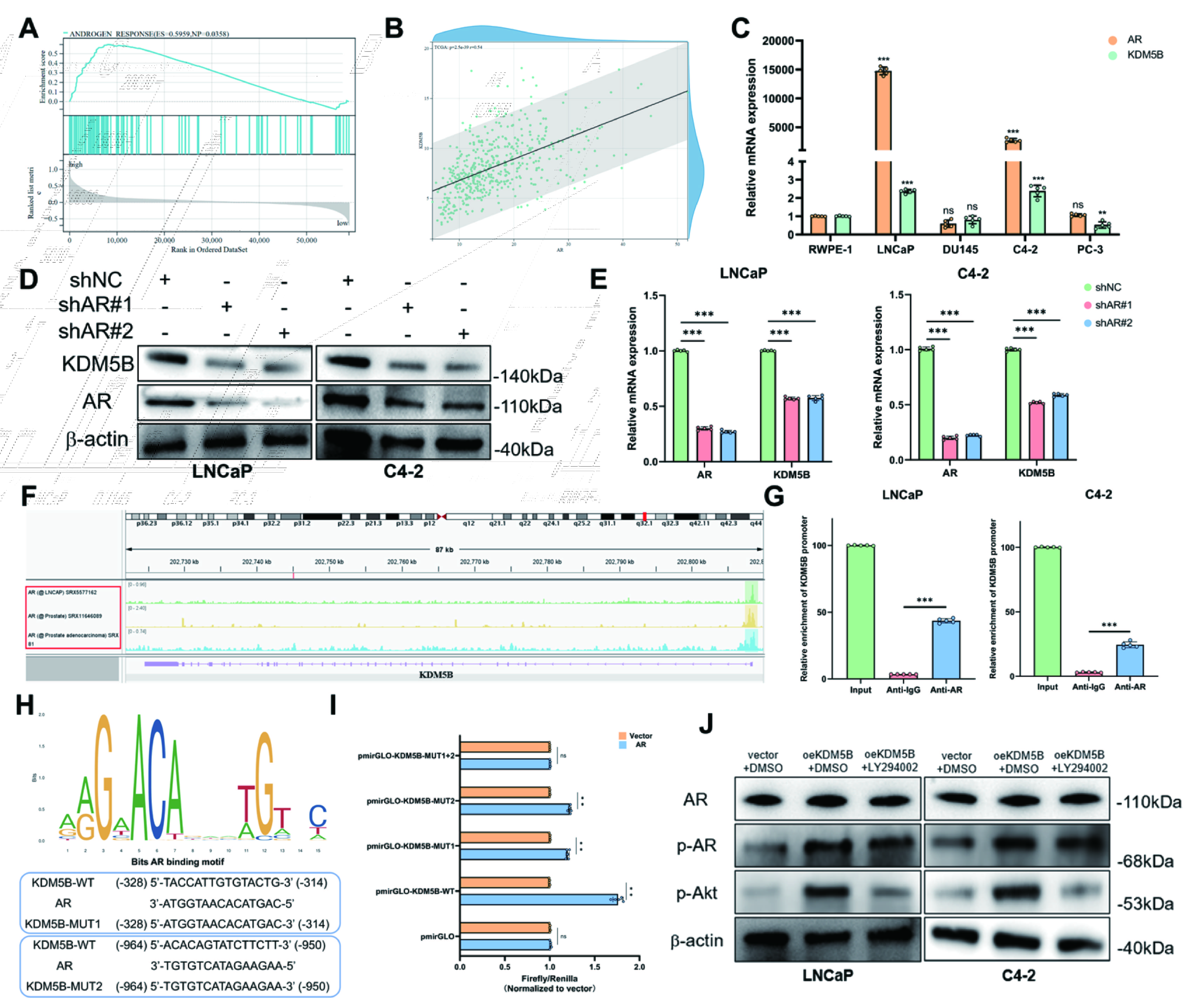 鉴于ENZA抗性PCa细胞中KDM5B表达升高,且AR在此过程中扮演重要角色,我们旨在利用TCGA-PRAD数据库中的RNA-seq谱分析KDM5B与AR之间的关系。GSEA显示KDM5B高表达组的“雄激素反应”通路显著富集,并且观察到KDM5B与AR mRNA水平之间存在强正相关。这一相关性进一步得到了我们的发现支持,即AR阳性PCa细胞系(LNCaP,C4-2)表达的KDM5B水平高于AR阴性系(DU-145,PC-3)。为了探讨潜在的直接调控关系,我们调节了AR活性。敲低AR会降低KDM5B表达,而AR过度表达则有相反效果。此外,通过AR配体二氢睾酮(DHT)刺激AR活性,或通过慢病毒递送增加AR蛋白水平,均导致KDM5B表达的剂量依赖性增加。