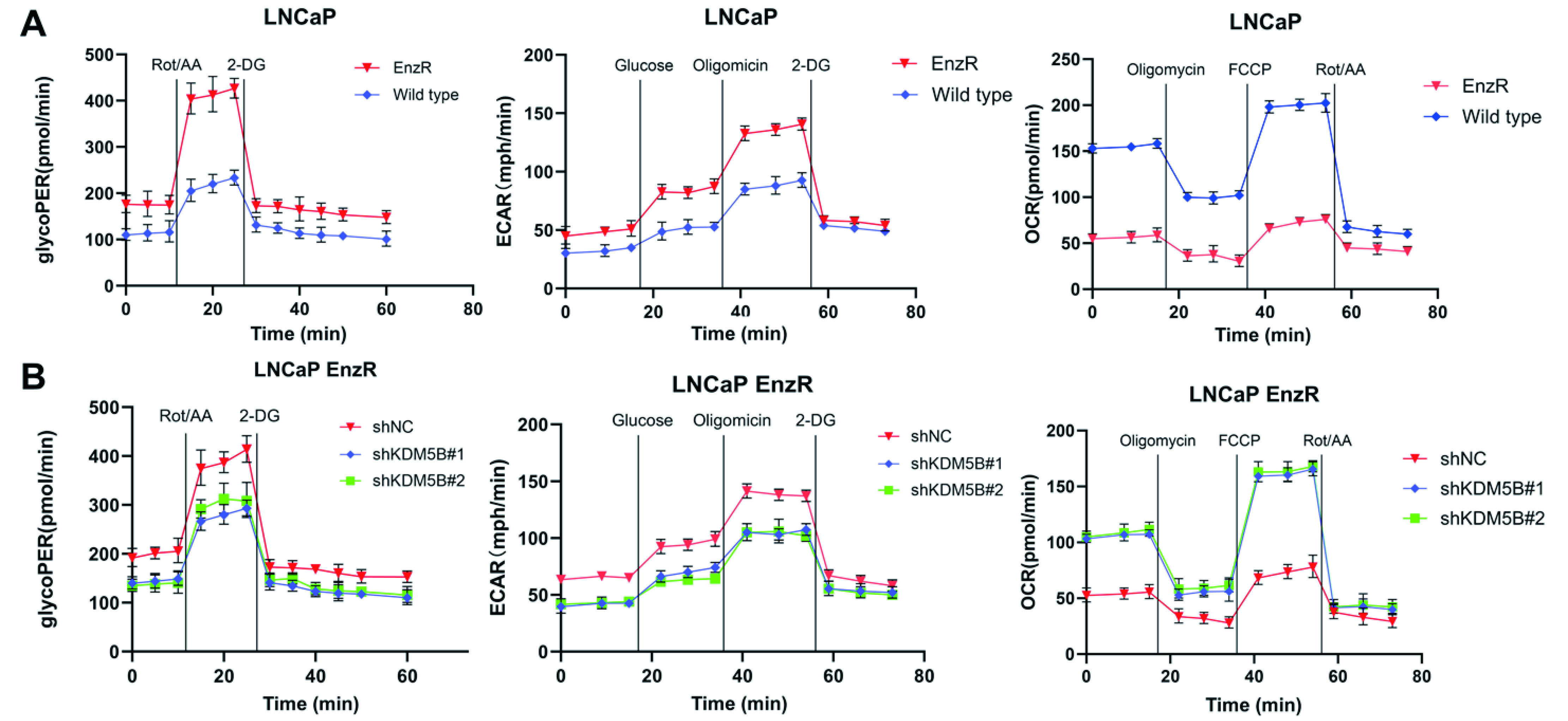 海马XF代谢通量分析。比较Enza敏感(EnzS)和抗性(EnzR)LNCaP细胞(A)在KDM5B敲低后(B)及亲本细胞KDM5B过表达(C)后,在EnzR细胞中的糖解质子外流速率(GlycoPER)、细胞外酸化速率(ECAR)和氧气消耗速率(OCR)。