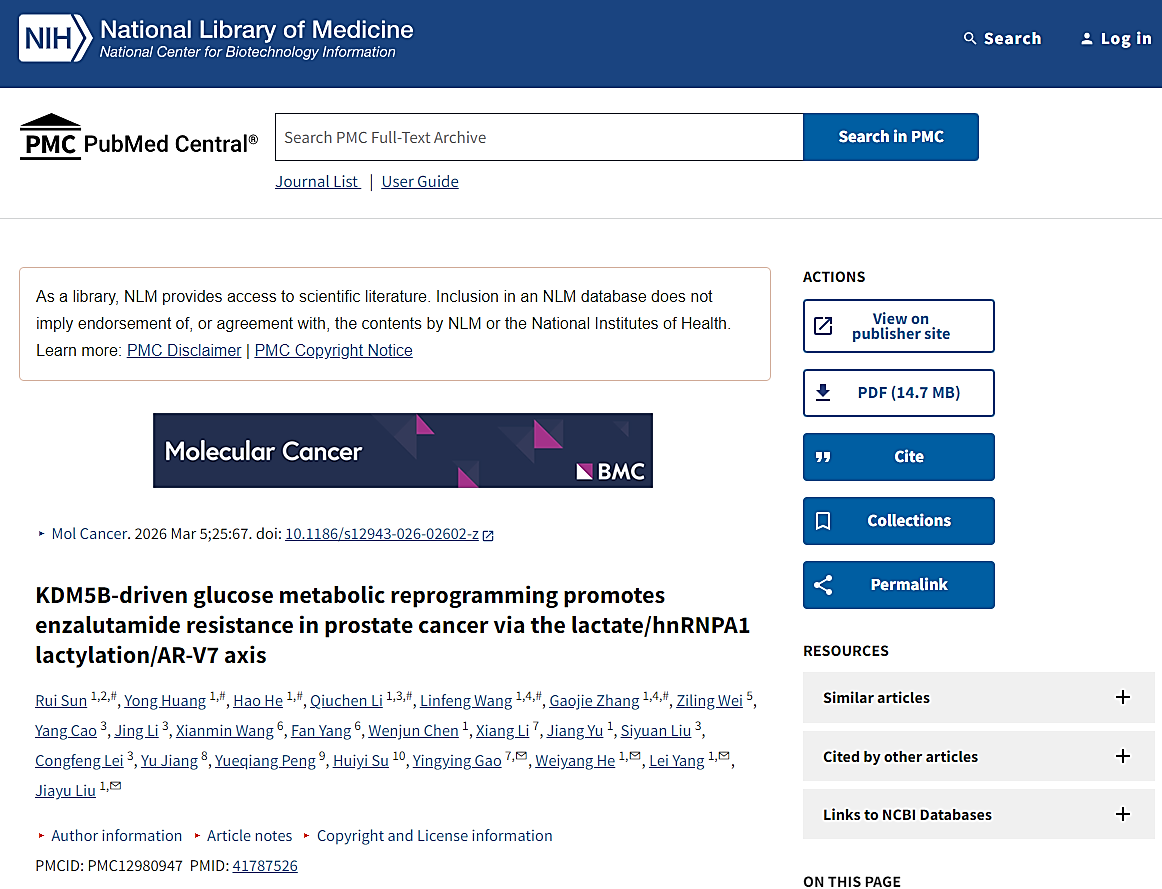 恩扎鲁胺耐药是去势抵抗型前列腺癌预后不良的重要原因,尽管已知 KDM5B 在耐恩扎鲁胺的去势抵抗型前列腺癌中高表达,但其介导耐药的具体机制尚不明确。本研究采用单细胞与多组学生物信息学分析结合体外、体内实验验证,并运用乳酰化蛋白质组学、CRISPR/Cas9、ChIP 及双荧光素酶报告实验等技术开展机制探究。结果显示,KDM5B 可通过表观遗传抑制 PTEN,激活 PI3K/Akt 通路,上调 PGK1 并引发代谢重编程与乳酸生成,进而诱导恩扎鲁胺耐药;乳酸可作为底物经 p300 介导 hnRNPA1 第 179 位赖氨酸乳酰化,阻断其 NEDD4L 介导的泛素化以稳定蛋白,促进 AR-V7 剪接,同时 KDM5B 与 AR 之间还形成正反馈环路进一步增强耐药。体内实验证实,抑制 KDM5B 或 p300 可逆转恩扎鲁胺耐药。本研究揭示了连接代谢、表观遗传与 KDM5B/AR 反馈环路的耐药新机制,提示多靶点干预有望成为克服去势抵抗型前列腺癌恩扎鲁胺耐药的有效策略。