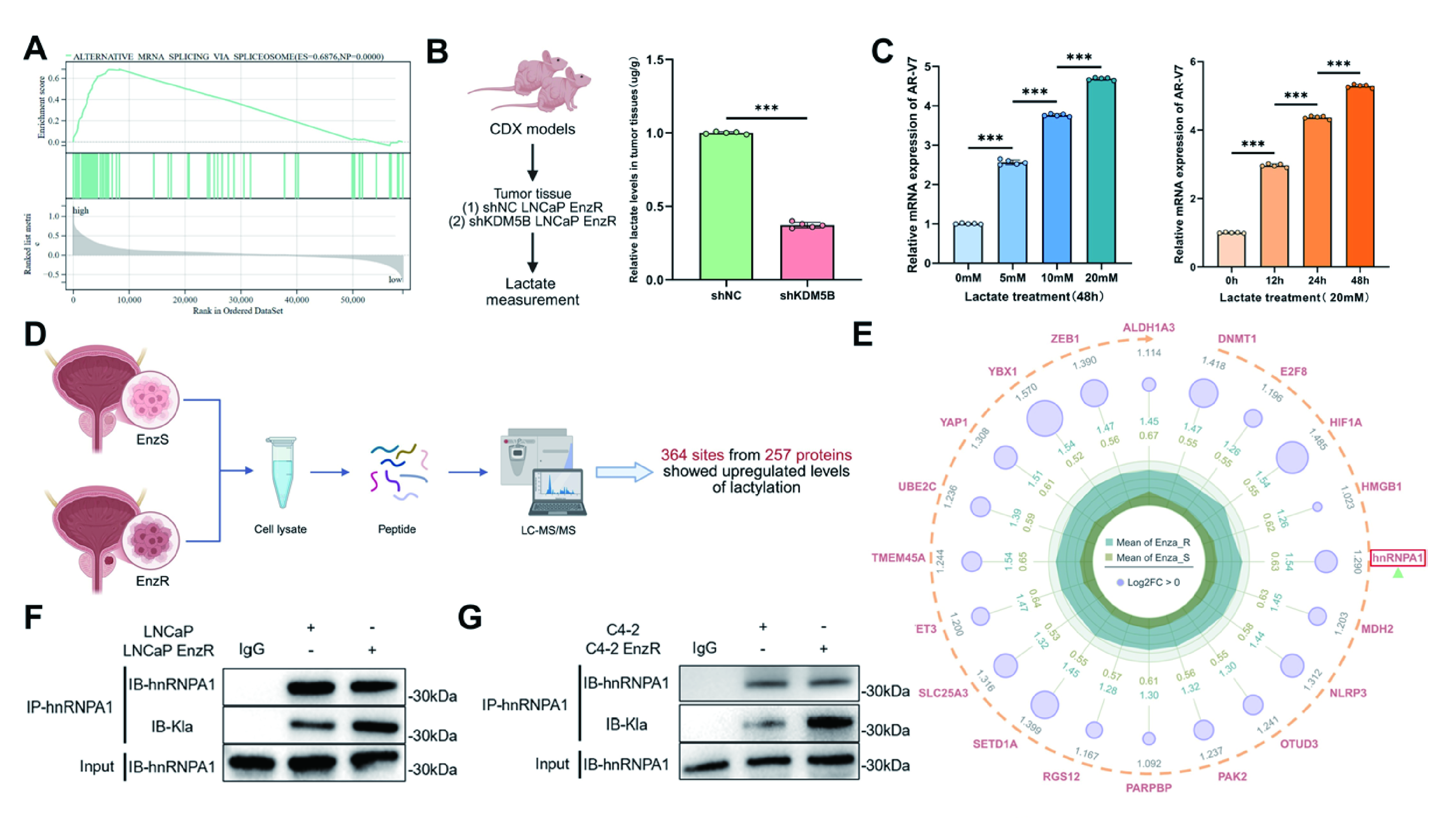 图4:hnRNPA1-K179的乳酸化驱动AR-V7剪接,并赋予PCa中的Enza抗性