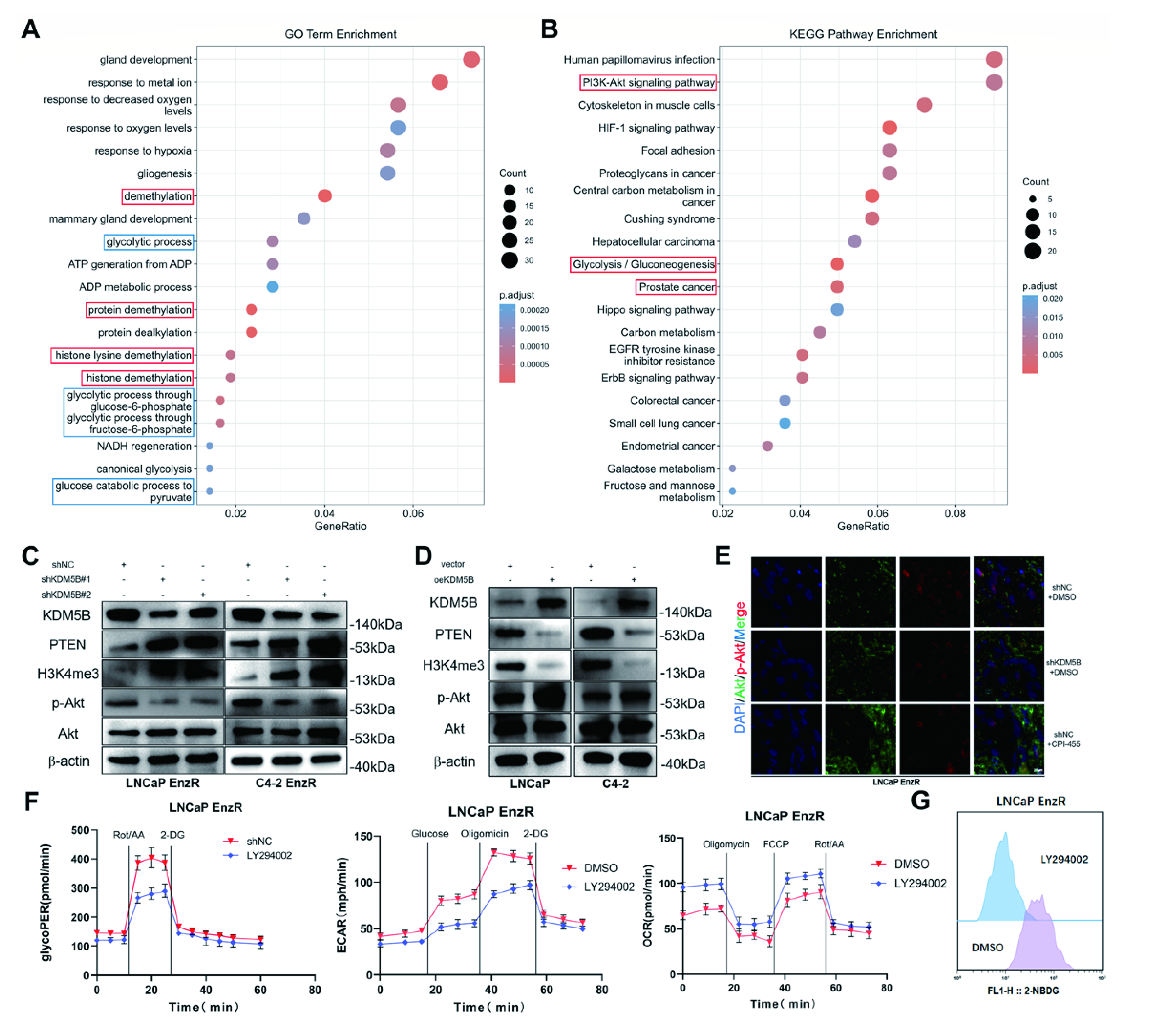 为研究KDM5B调控的下游通路,我们分析了来自KDM5B过表达RNA-seq数据集中的差异表达基因(DEGs)。从功能上讲,DEGs指向两个主要的生物学主题。首先,如预期,与KDM5B核心酶功能相关的Go术语,如“组蛋白赖氨酸脱甲基化”和“组蛋白脱甲基化”,被富集。其次,且更具机制性的是,KEGG通路分析发现了“糖酵解/糖新生”和“PI3K-Akt信号通路”的富集。这一发现与scRNA-seq分析一致,后者还显示KDM5B+耐药细胞中PI3K-Akt通路富集。