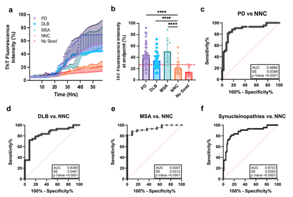研究团队对130例尸检头皮皮肤样本(87 例患者 + 43 例健康对照)开展研究,证实突触核蛋白病患者的皮肤样本可诱导重组α-突触核蛋白聚集,健康对照则无此反应,明确皮肤中异常α-突触核蛋白可作为这类疾病的通用检测标志物,且皮肤RT-QuIC检测诊断准确性较高,多系统萎缩 AUC 值达 0.9387、帕金森病达 0.8866。