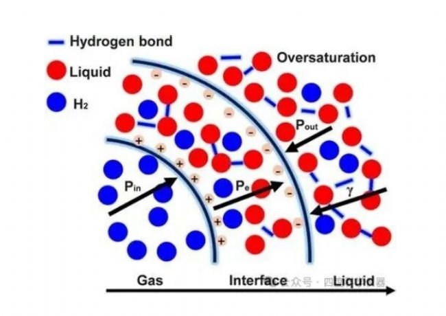 氢键作用与界面层形成提供重要支撑。气泡表面负电荷通过氢键吸引水分子,形成致密水化膜作为物理屏障,降低氢气扩散速率;溶液中Na⁺、Ca²⁺等离子在双电层积累形成屏蔽层,进一步阻碍气体扩散并维持表面电荷稳定,气泡表面羟基与离子的相互作用也能加固界面层。
