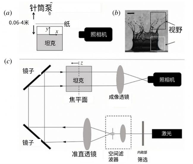油层组成和厚度各不相同。在第三个系列中,油层组成、厚度和液滴速度变化较大。在所有情况下,过滤后的自来水“雨滴”都由一台计算机控制的注射泵产生,该泵通过软管连接到不锈钢钝头分配针,该针安装在水箱底座上方,以实现各种雨滴冲击速度。丙烯酸盐罐装满人造海水至深度为8厘米。在可视化方面,水箱由500W卤素灯泡背光,光线由半透明粘合纸扩散。图像由配备高速摄像机(pco.dimax)记录。对于系列--可视化,CMOS传感器分辨率为2016像素×2016像素,视场为5.7厘米*5.7厘米,帧率为1000fps,曝光时间为100us。空间分辨率为水面以上28.8 um像素,水面以下28.2um像素。对于与其他油的可视化,传感器尺寸减小到1824×1888使采集速率提高到1500fps,曝光时间为300us。在实验过程中,液滴稳定地产生在0.5fps的速度,以实现可重复性。放置在油箱上方的吸附纸充当“百叶窗”,当浮油被暂时移走时,只允许一滴水滴通过,冲击浮油。