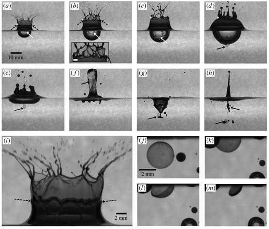 液滴对大体积流体的高速撞击与雨滴对海面的影响产生海洋气溶胶有关。这些溅射产生一个下表面空洞和一个顶部,顶部封闭成一个气泡罩,但漂浮的不可混溶的油层,例如原油浮油,改变溅射动力学。通过高速可视化研究了油层流体性质、厚度、液滴大小和冲击速度的影响。用尺度标度法对油层破裂和冠层性质进行了分类。