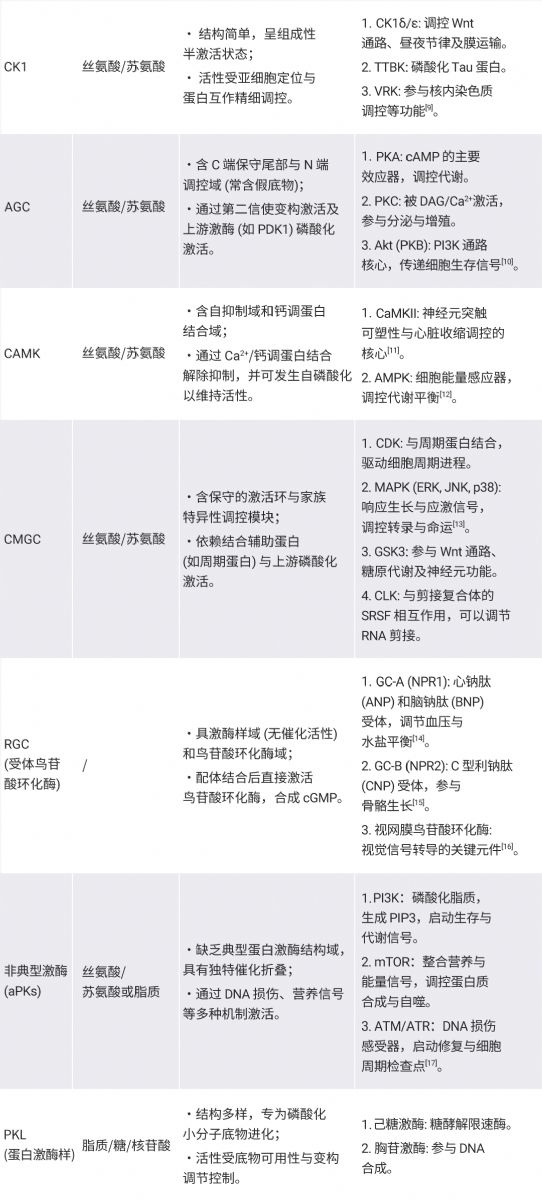 基于对激酶催化结构域序列与功能的系统研究,人类激酶组又可分为两大范畴:典型蛋白激酶 (ePKs) 与非典型蛋白激酶 (aPKs)。