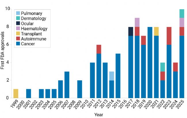 图 2. FDA 激酶抑制剂批准情况,按年份和治疗领域划分[18]。