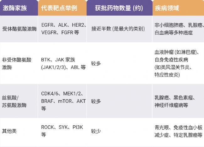 总的来说,已获批激酶抑制剂的靶点分布高度集中于驱动癌症和自身免疫性疾病的关键信号通路上,尤其是酪氨酸激酶家族。