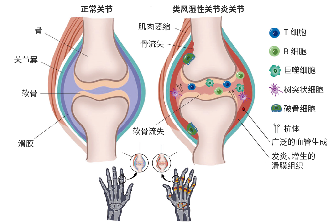 图 1. 正常关节与类风湿性关节炎关节[1]。