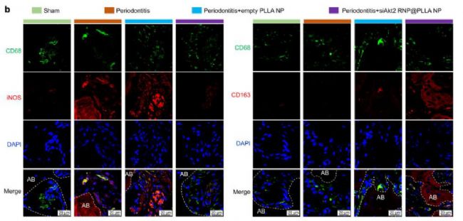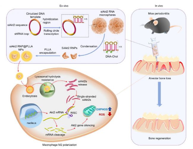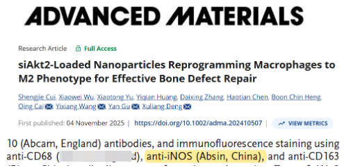 在组织再生领域,巨噬细胞的极化状态直接决定修复结局 —— 促炎 M1 表型加剧组织损伤,而促再生 M2 表型则为修复创造理想微环境。如何高效、精准地诱导巨噬细胞从 M1 向 M2 极化,一直是临床转化中的核心难题。近期发表于《Advanced Materials》的一项重磅研究,创新性地构建了 siAkt2 负载纳米递送系统,成功实现巨噬细胞代谢重编程与极化调控,为牙周炎等炎症相关骨缺损修复提供了全新策略。Absin 作为关键试剂供应商,其优质产品为该研究的顺利开展提供了坚实支撑。