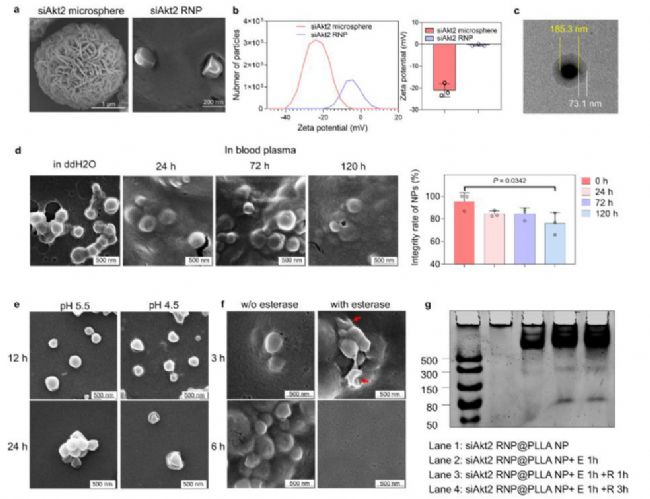 图 2 原文 Figure 1:a) siAkt2 微球与 RNPs 的形态;c) TEM 下 NPs 核壳结构;d) 体液中稳定性;e) 酸性环境下形态变化