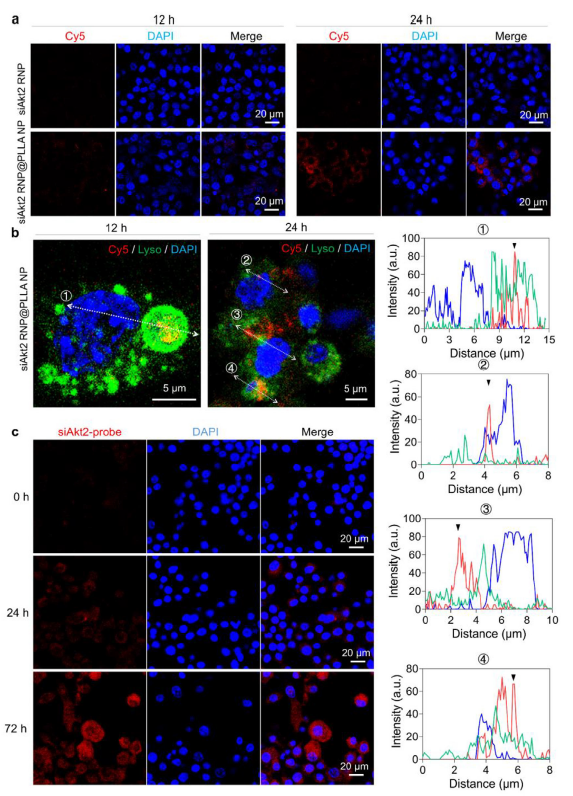 PLLA 外壳显著促进巨噬细胞内吞,24 h 即可实现高效溶酶体逃逸,持续释放 siAkt2,转染效率远超传统脂质体载体(图 3,对应原文 Figure 2a-b)。